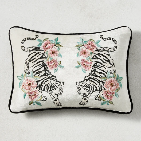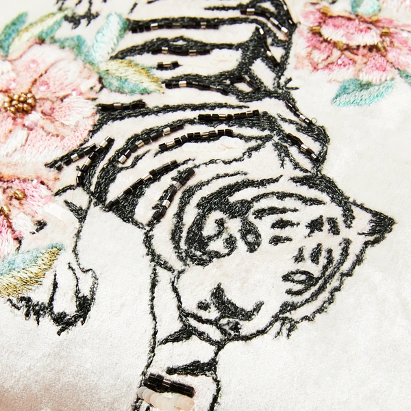 A standout addition to any space, this pillow is made from plush velvet and embroidered with an intricate tiger-and-floral design. Sequins add a sparkling finishing touch.