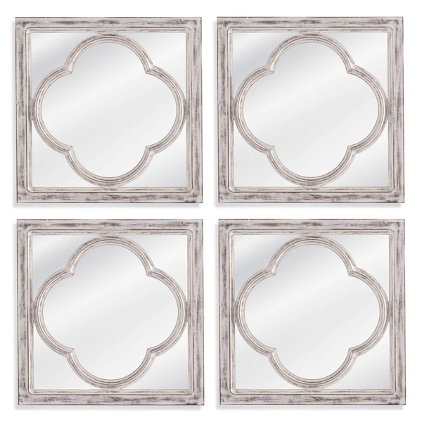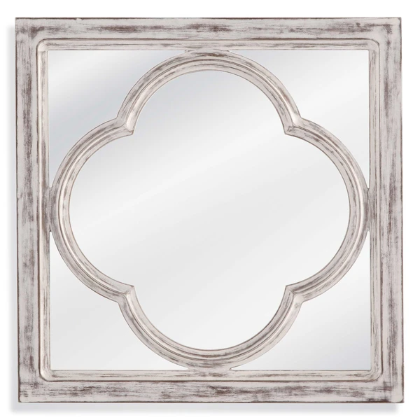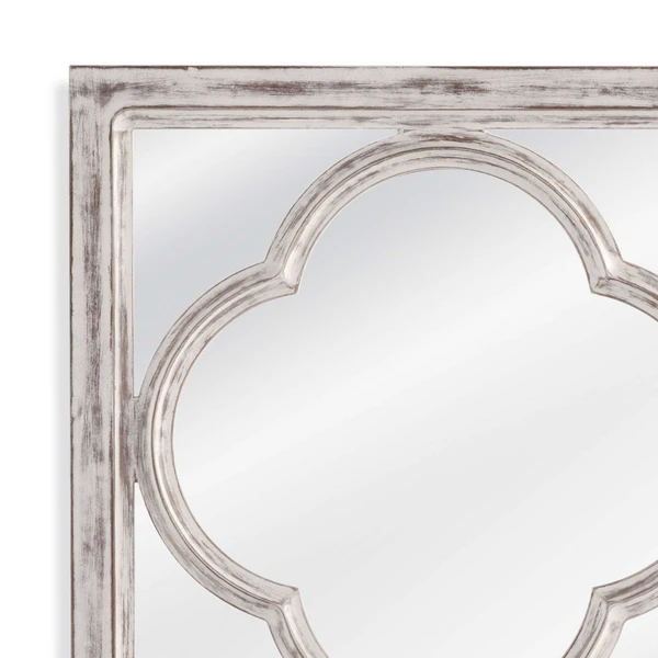 Our Alaina Mirror features a quatrefoil design overlaid on a clear mirror. It is finished in distressed white and makes a statement wall hung as multiples.