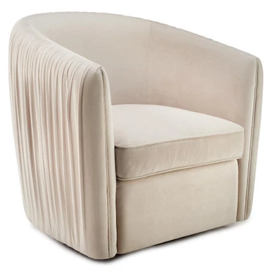 Framed in kiln-dried hardwood with a classic barrel silhouette, ample padding, and pleated upholstery, this swiveling glider offers style and cozy comfort from all angles. Shown in Bella Velvet Pearl.
