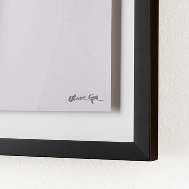 - Pedestal-mounted glossy art print is set off against a black mat, mounted within a high gloss black wood shadowbox frame, and set under plexiglass.