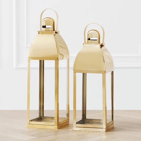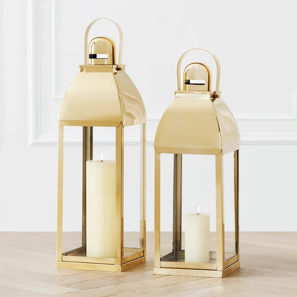 An elegant interpretation of the classic lantern. Our Bradford lanterns feature an oversized design in long-lasting stainless steel with a soft gold finish. Find just the right placement — lighting the foyer, framing the hearth, or enhancing a dark nook — with easy-to-use top handles and hinged glass doors. Sold separately.