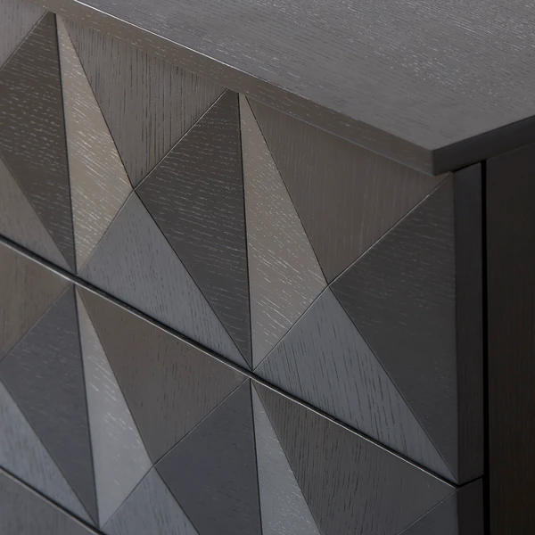 A textural delight, this eye-catching dresser is framed in kiln-dried hardwood and wrapped in rustic oak veneers with an expressive grain that beautifully highlights its faceted, dimensional design. Two push-latch drawers and an open shelf offer plenty of bedside storage.