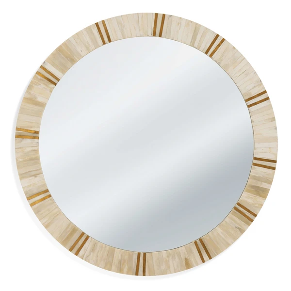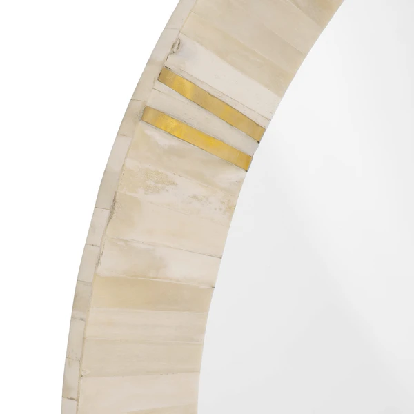 Our Brooklyn Mirror is round featuring natural cream colored bone with brass accents. The hand crafted details produced by a skilled artist lends itself to a unique technique and will vary slightly.