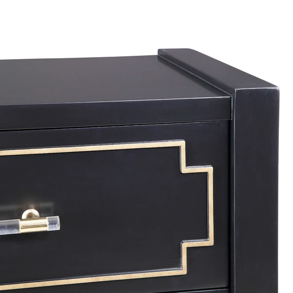 The Deacon Dresser features smooth black lacquer finish on the case and drawers with gold trim on drawers, acrylic and gold bar hardware.