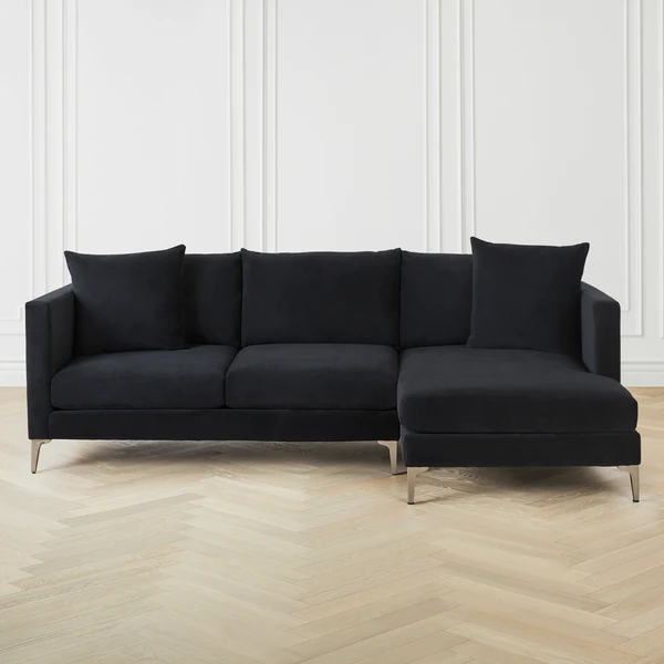Offering countless combinations with three arm styles (track, slope, or soft roll), two cushion fills (for a plush or structured look), two leg finishes (brushed silver or espresso), and over 30 gorgeous fabrics, the pieces in our Details Collection will complement your unique style, whether it’s glam, modern, traditional, casual, or anything in between. Shown in Bella Velvet Black with brushed silver legs.