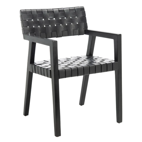 With its angled mahogany framework, woven leather seat, and black finish, this chair brings sleek, contemporary style and comfort to the dining room.
