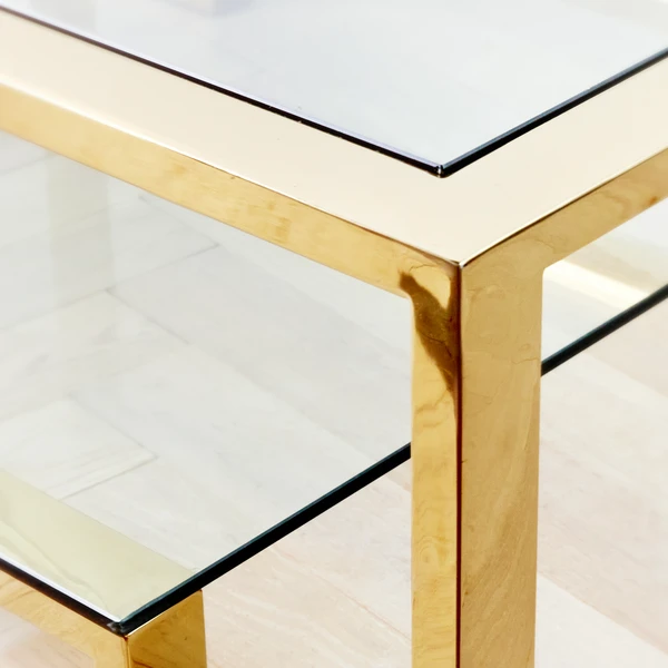 Duplicity collection is designed with form and function in mind. Constructed of stainless steel and glass, with a floating bottom shelf for clean and simple storage.