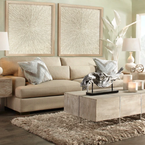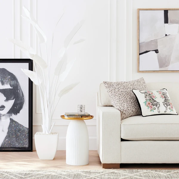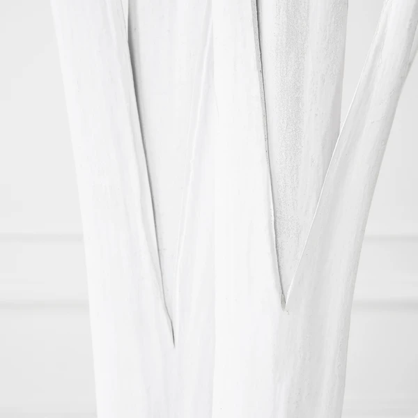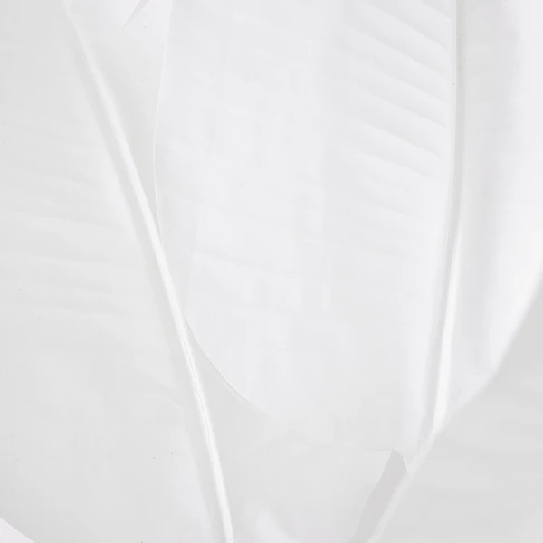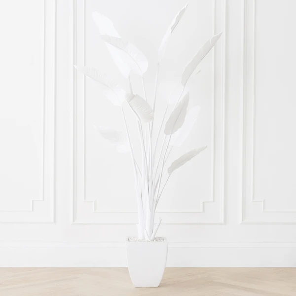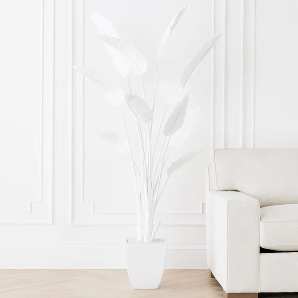 Interpreted in neutral white, this Palm tree offers just a subtle suggestion of lush tropical foliage. Already arranged in a tailored pot, it measures 72” tall.