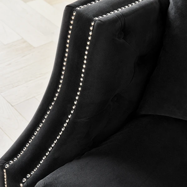 Combining notched arms, deep button tufting, and gleaming nailhead trim, the handcrafted pieces in our Hampstead Collection deliver timeless elegance and a dash of glamour to any room, while kiln-dried hardwood frames and ample padding ensure long-lasting comfort and support. Shown in Bella Velvet Black with bright nickel nailheads.