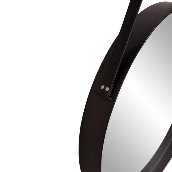 British explorers for years have inspired everything from furniture to accessories. Their adventures often referred to as campaigns has created a design sensation. A mirror was often part of these travels and featured a leather strap that could be used to hang it from the tent or a tree. Hence the inspiration for our Huntley Wall Mirror. A round stainless steel frame finished in brushed black features a leather strap. A matching round hanging knob affixes to the wall.