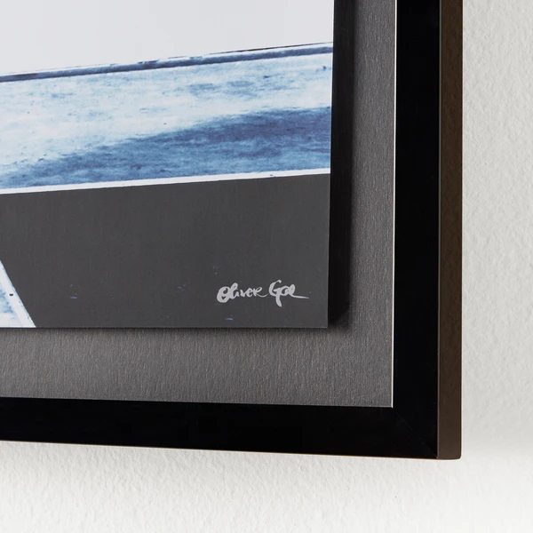 - Pedestal-mounted glossy art print is set off against a black mat, mounted within a high gloss black wood shadowbox frame, and set under plexiglass.
