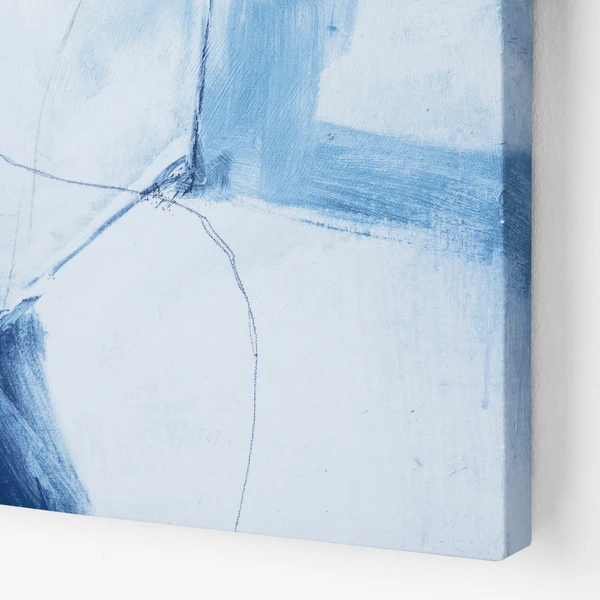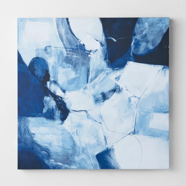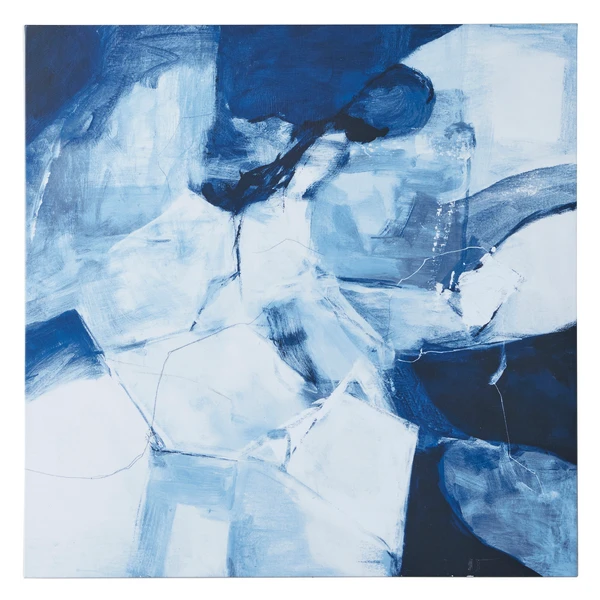Shades of blue are celebrated in the series entitled Light Taming. These dynamic abstract pieces are perfectly square and engage the eye in a remarkable way. Created with giclee on canvas, each piece has an image brush gel finish. Hand-painted strokes of the original image are applied with a brush. 1 of 2 in a series.