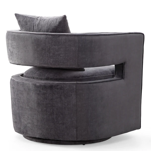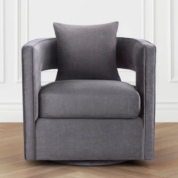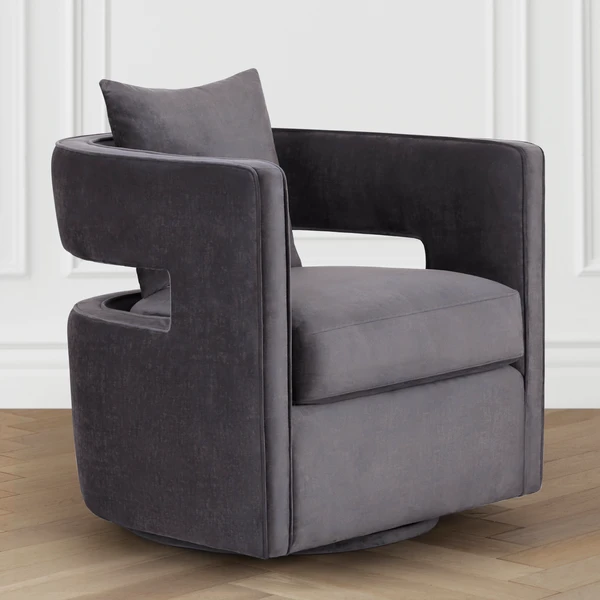 With its barrel back, cutout arms, and Grey velvet upholstery, this swivel chair adds instant glamour to a room. A kiln-dried frame and plush foam-and-fiber fill ensure long-lasting comfort and support.