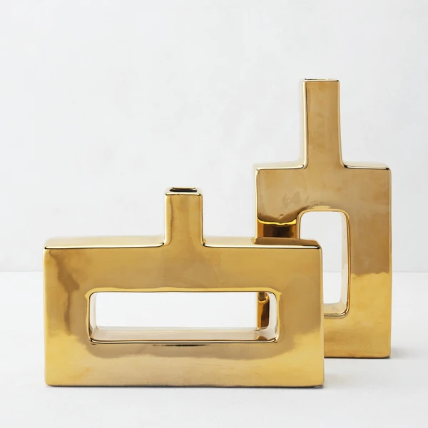 Z Gallerie’s very contemporary gold-hued Miami Vases partner successful design with optional functionality. We’ve created these decorative vases exclusively for our customers to enjoy as unique sculptural pieces and/or to fill with decorative foliage. Crafted of ceramic with a stylish gold glaze, the vases are available in two sizes to create a pleasing composition when paired. Also available in Silver and White.