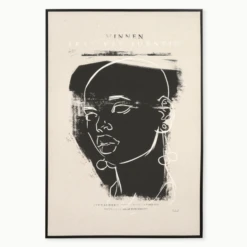 Minnen Face is a gallery-wrapped natural linen canvas set in an espresso wood tone floater frame.