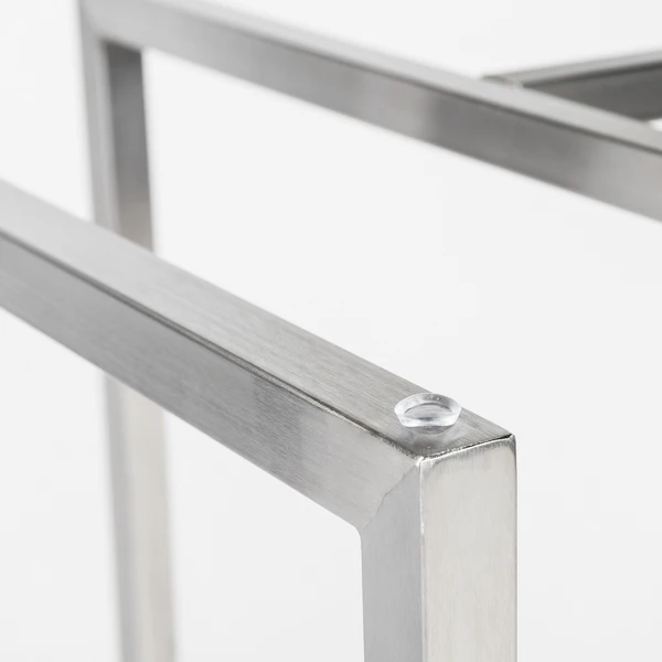 The Minnie Dining Table pairs the flexible Minnie Table Base with a round clear tempered glass top. Adjustable feet provide stability.