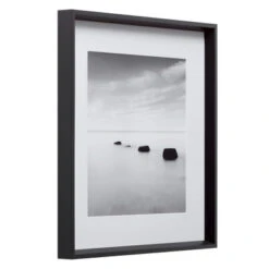 - Print set under glass with a white mat and solid wood frame with a black finish