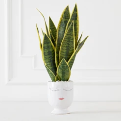 A faux premade with a touch of whimsy featuring green and yellow Mother In Laws Tongue in a painted planter.