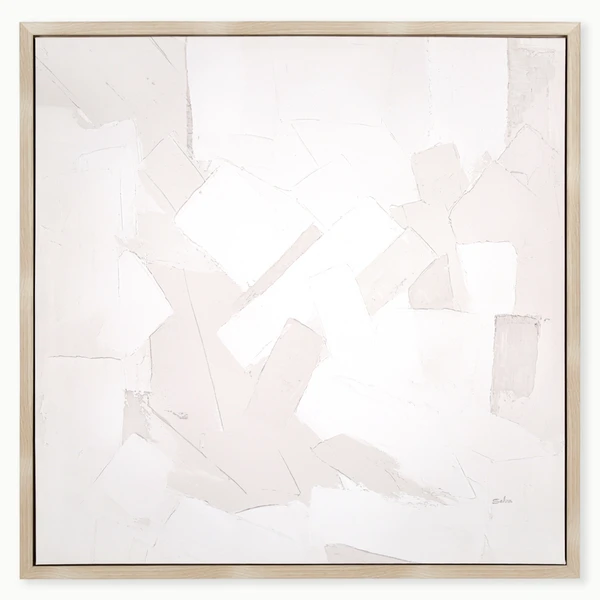 Neutral Layers is a gallery wrapped canvas with hand-applied pallet knife embellishment and set in a blonde floater frame.