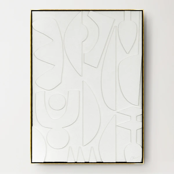 This piece by Nikki Chu is stunning and unique. A vision in monochrome, All White I will add texture and dimension to your wall. Layered birchwood is 100% hand-painted and framed in gold. Hang vertically or horizontally. Complete the look with All White II.