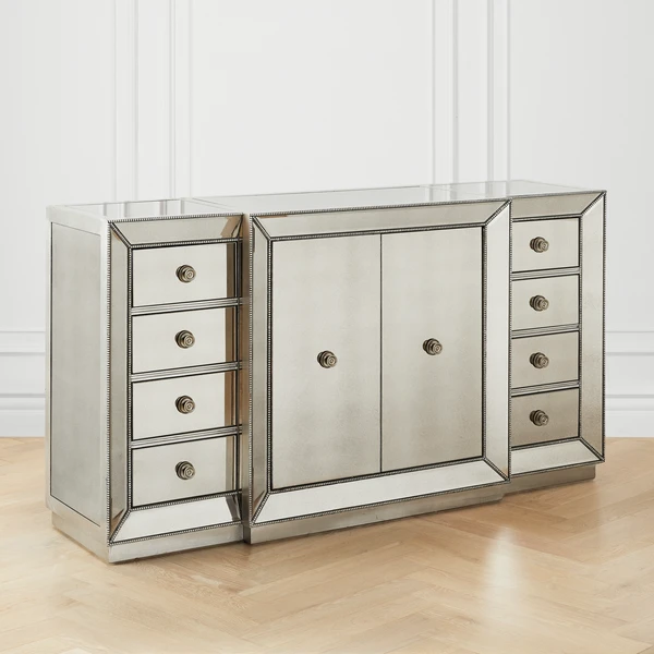 Bring glamour to any room with our Omni Mirrored Collection. It’s streamlined silhouette is fitted with antique beveled mirrored panels and trimmed with silver beaded details.