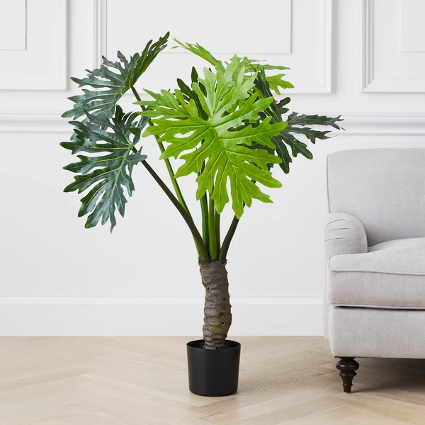 Housed in a black pot, this faux-plume leaf tree will look lush and lifelike all year long.