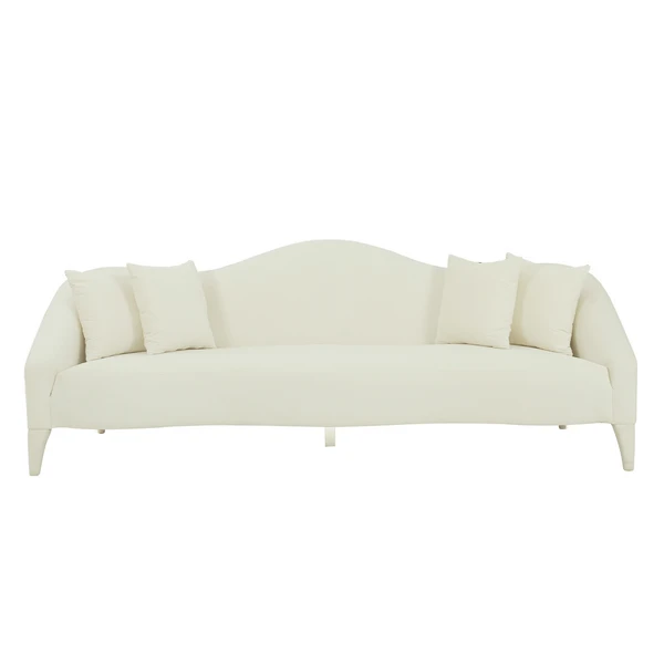 Timelessly elegant, this sofa is framed in kiln-dried wood frame with a graceful silhouette, camel back, and plush velvet upholstery. Fiber-wrapped foam fill and four throw pillows offer long-lasting comfort and support.