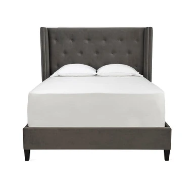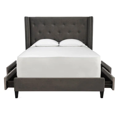 Our Porter collection elevates the comforts and function of your bedroom. The clean lines and modern details make a statement in the room while the four upholstered storage drawers lend a hand for your storage needs. Shown in Bella Velvet Otter with bright nickel nailheads.