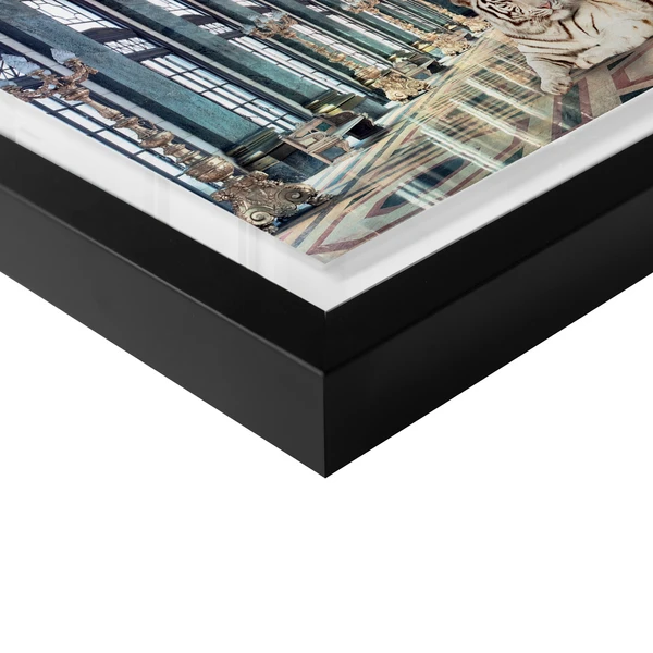 - Glossy art print mounted within a high gloss black wood shadowbox frame and set under plexiglass.