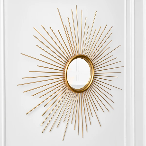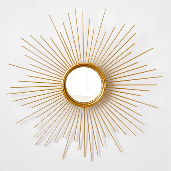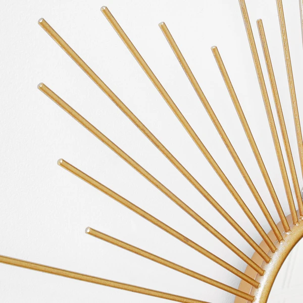 A standout addition to any space, this round convex mirror is surrounded by a sunburst frame with a gleaming gold finish.