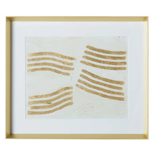 Full of energy and movement, this work from artist Melissa Wang is embellished with gold-leaf paint and a matte gel finish for gorgeous texture and shine. Printed on paper, this piece is matted and displayed under glass in a solid wood frame with a gold finish.