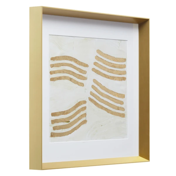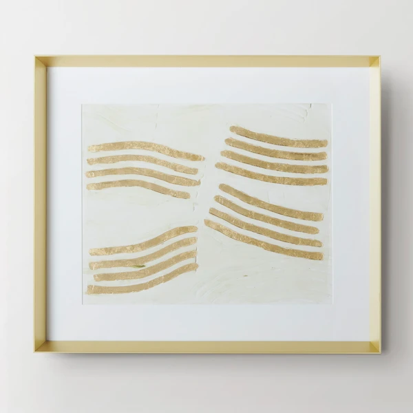 Full of energy and movement, this work from artist Melissa Wang is embellished with gold-leaf paint and a matte gel finish for gorgeous texture and shine. Printed on paper, this piece is matted and displayed under glass in a solid wood frame with a gold finish.