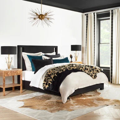 Framed in sturdy kiln-dried hardwood, our Roya platform bed boasts an elegant, clean-lined silhouette, neatly tailored upholstery, and side cutouts on the headboard for added impact and drama. Shown in Bella Velvet Black.