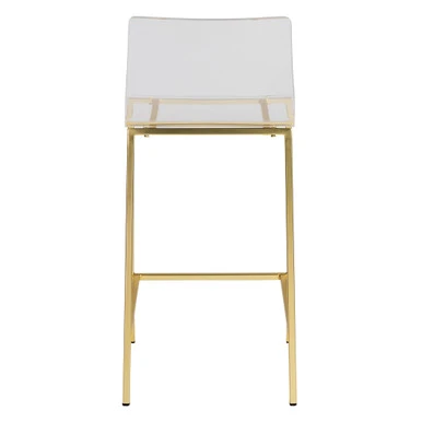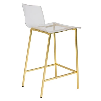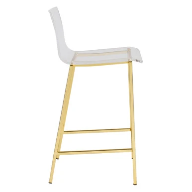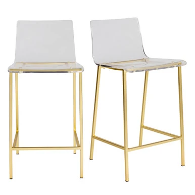 Sleek and modern, this pair of counter stools flaunt beautifully contoured clear acrylic seats atop clean-lined steel frames finished in matte, brushed gold.
