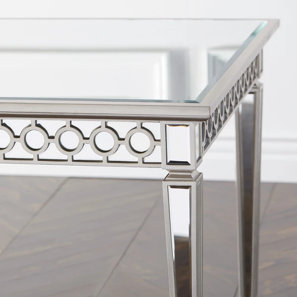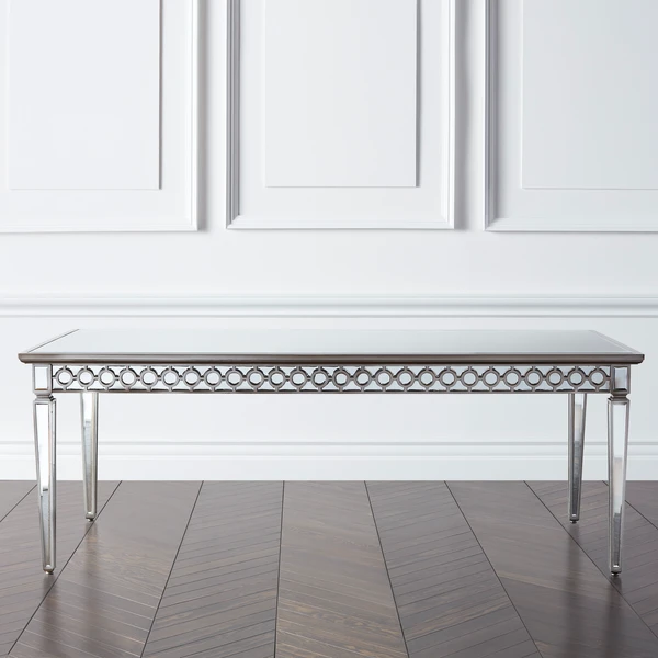 Sophisticated, graceful and elegant our exclusive Sophie Mirrored Dining Table demonstrates style and restraint with its contemporary design. While elegantly reflecting its surroundings this collection combines glamour with modernism. A beveled mirror adorns the table top, while side aprons are decoratively detailed with hand-applied beveled mirrors creating a chic interlacing circular pattern.