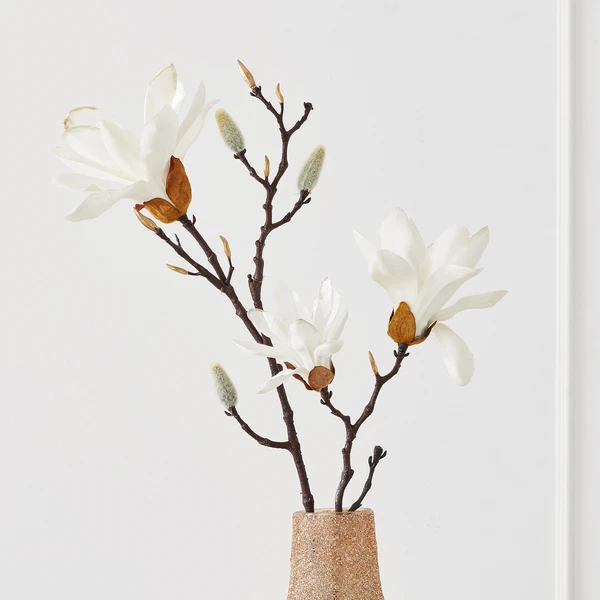 Faux magnolia blossoms make effortless floral arrangements. Pliable wired stems allow for flexibility in arranging.