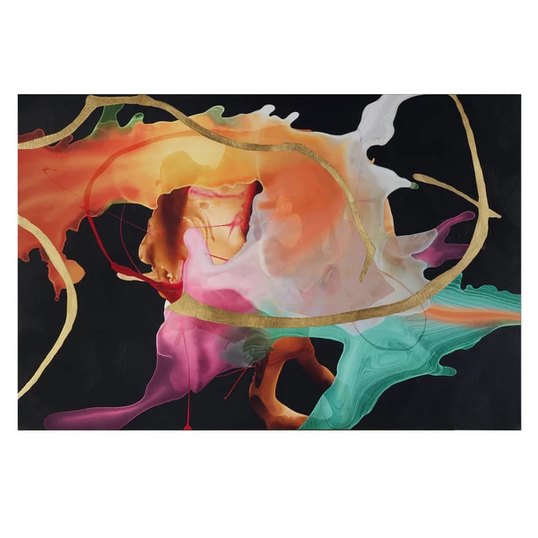 Printed on canvas with hand-applied gold embellishments, this modern abstraction enlivens any wall with its fluid brushstrokes and bold use of color. Unframed.
