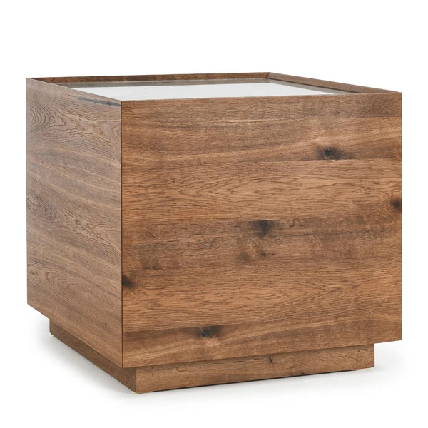 Designed as a modern showpiece, this end table features a sharp, linear pattern carved into its top. Glass protects the etched design with a gleaming, reflective surface. With its warm wood finish, this piece suits any color scheme.